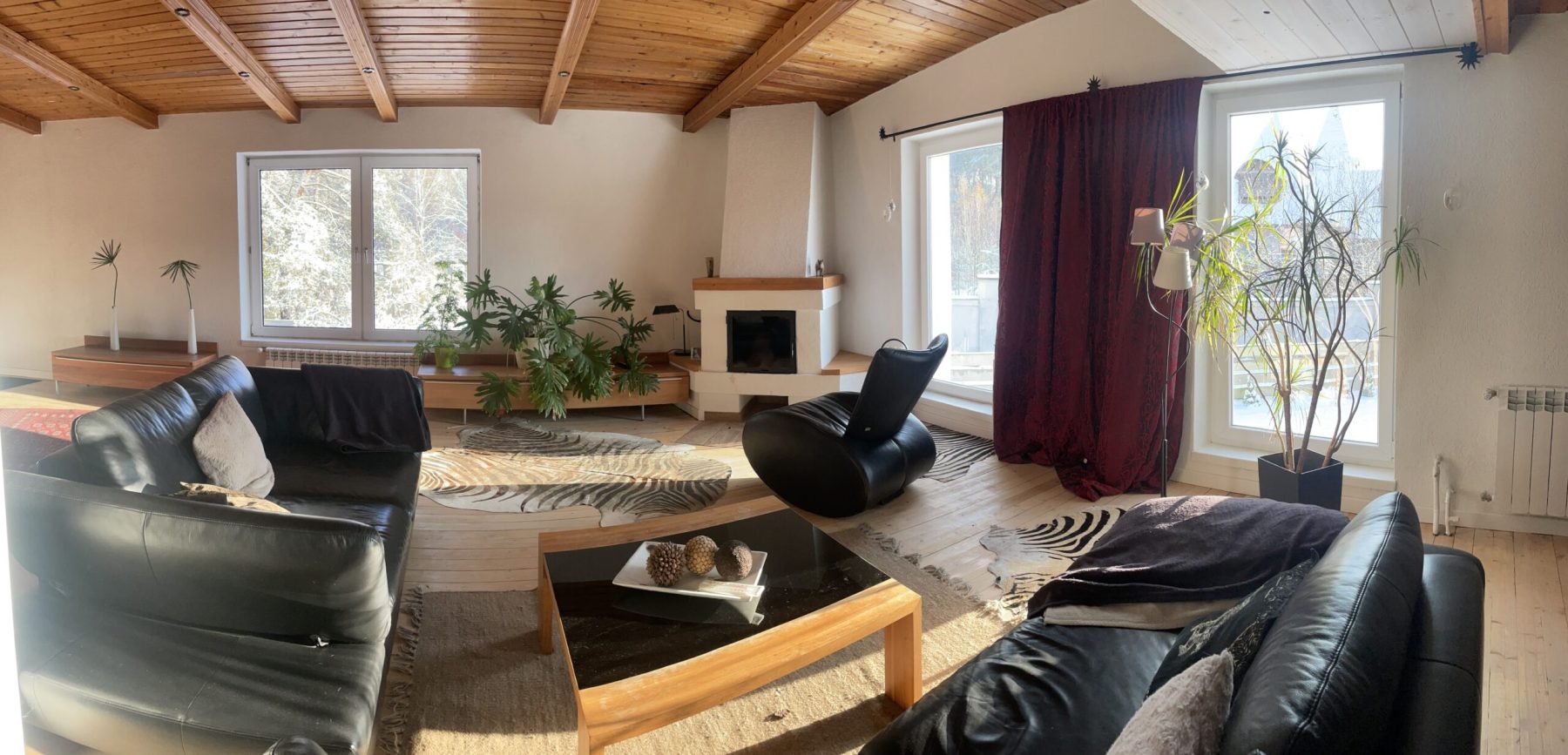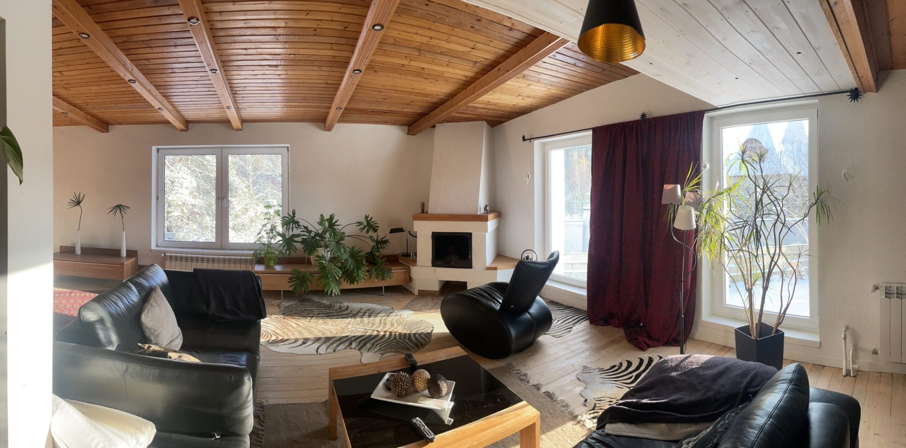 Na dolnym poziomie znajduje się przestronny salon z kominkiem, który stanowi centralny punkt apartamentu i tworzy wyjątkową, przytulną atmosferę. Strefa wypoczynkowa została wyposażona w eleganckie, skórzane kanapy klasy premium oraz białe, skórzane leżanki, zapewniające najwyższy komfort relaksu i podkreślające luksusowy charakter wnętrza. Całość dopełniają wysokiej klasy meble marki Hülsta, cenionej za perfekcyjne wykonanie i ponadczasową estetykę.