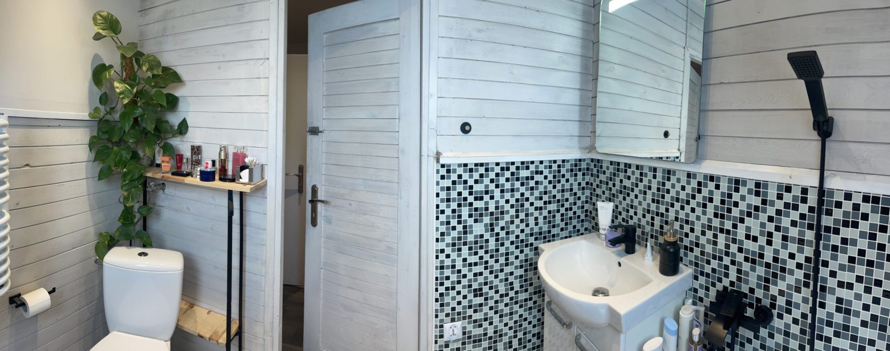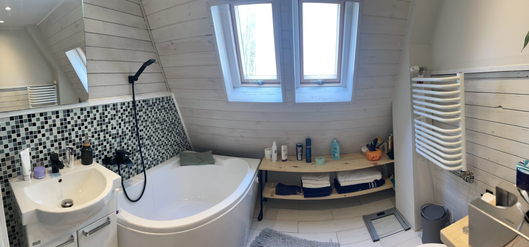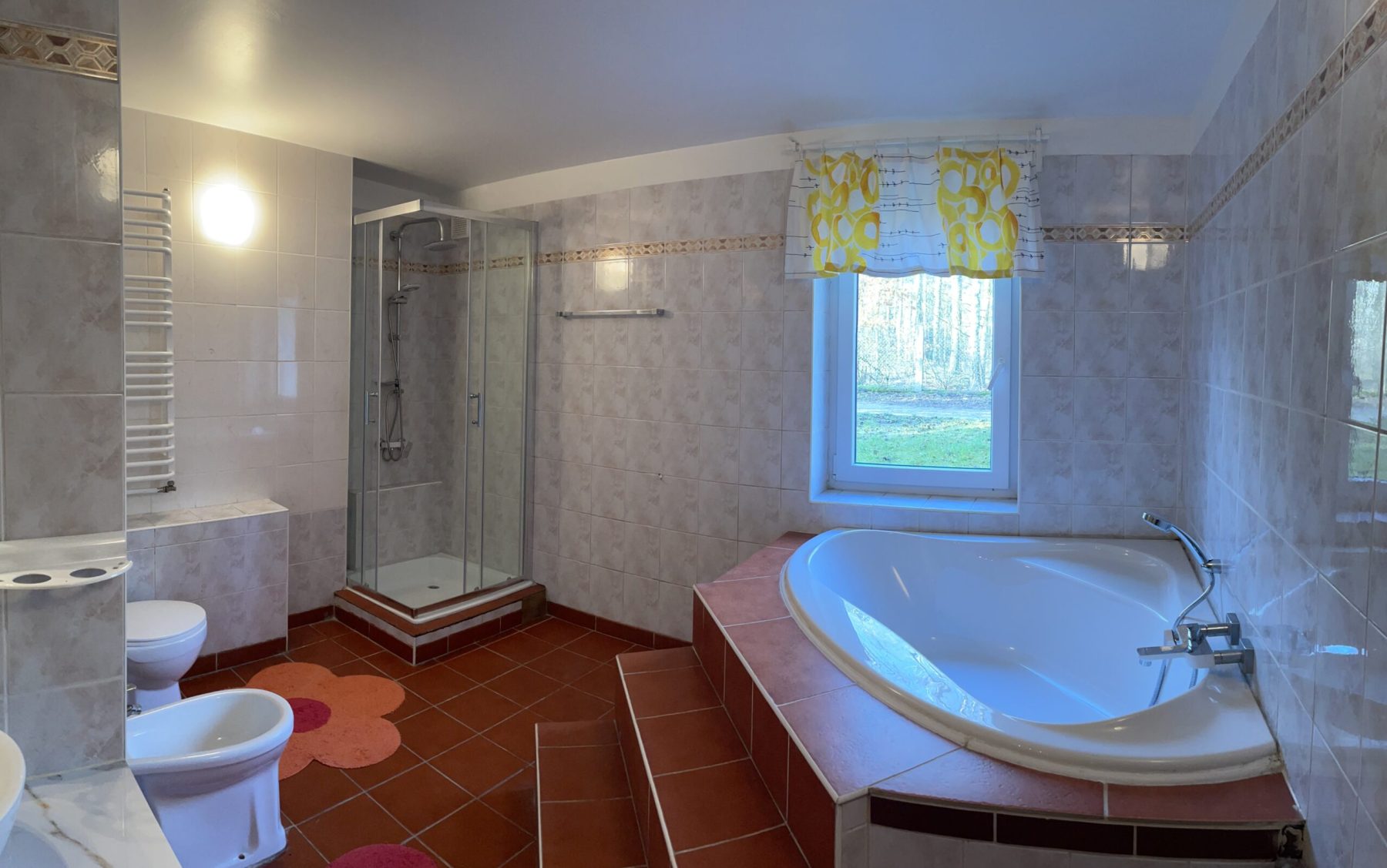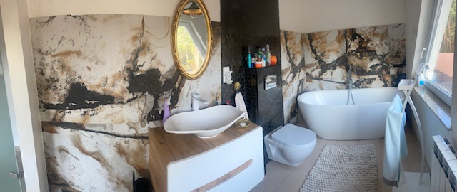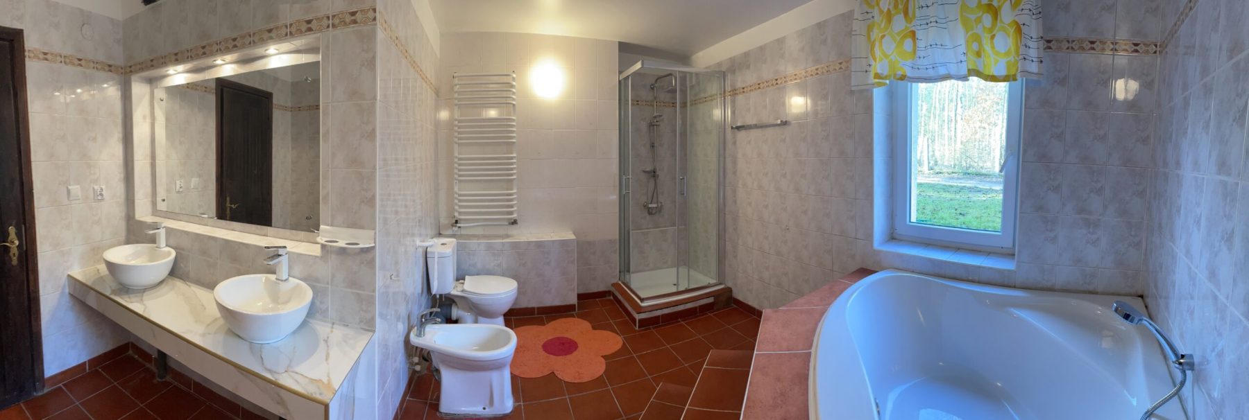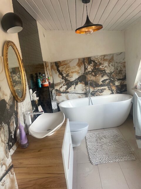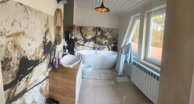 Do dyspozycji mieszkańców jest duża, komfortowa łazienka, zaprojektowana jako prywatna strefa relaksu. Jej centralnym elementem jest wolnostojąca wanna, która podkreśla luksusowy charakter wnętrza i zapewnia wyjątkowy komfort codziennego użytkowania. Całość uzupełnia elegancka armatura oraz wysokiej jakości materiały wykończeniowe.
