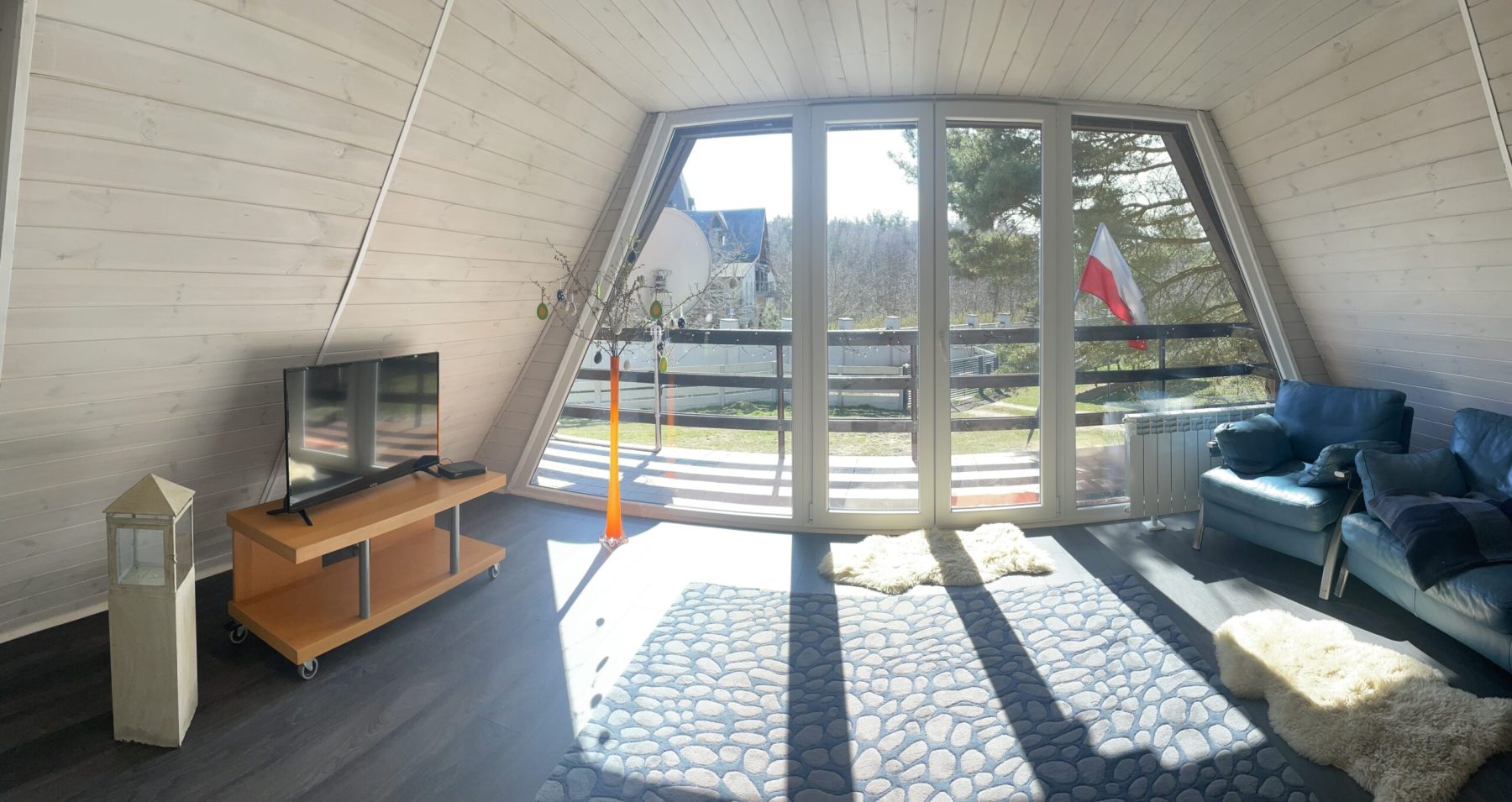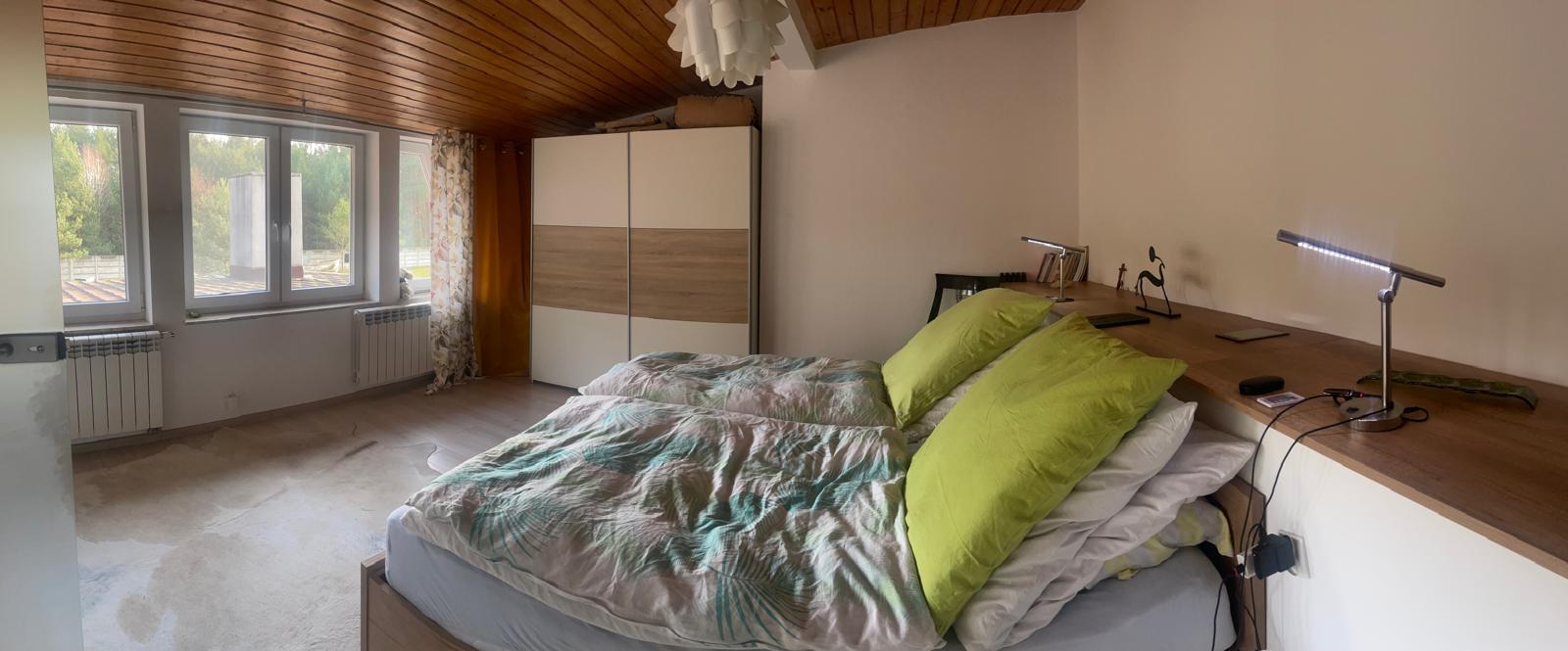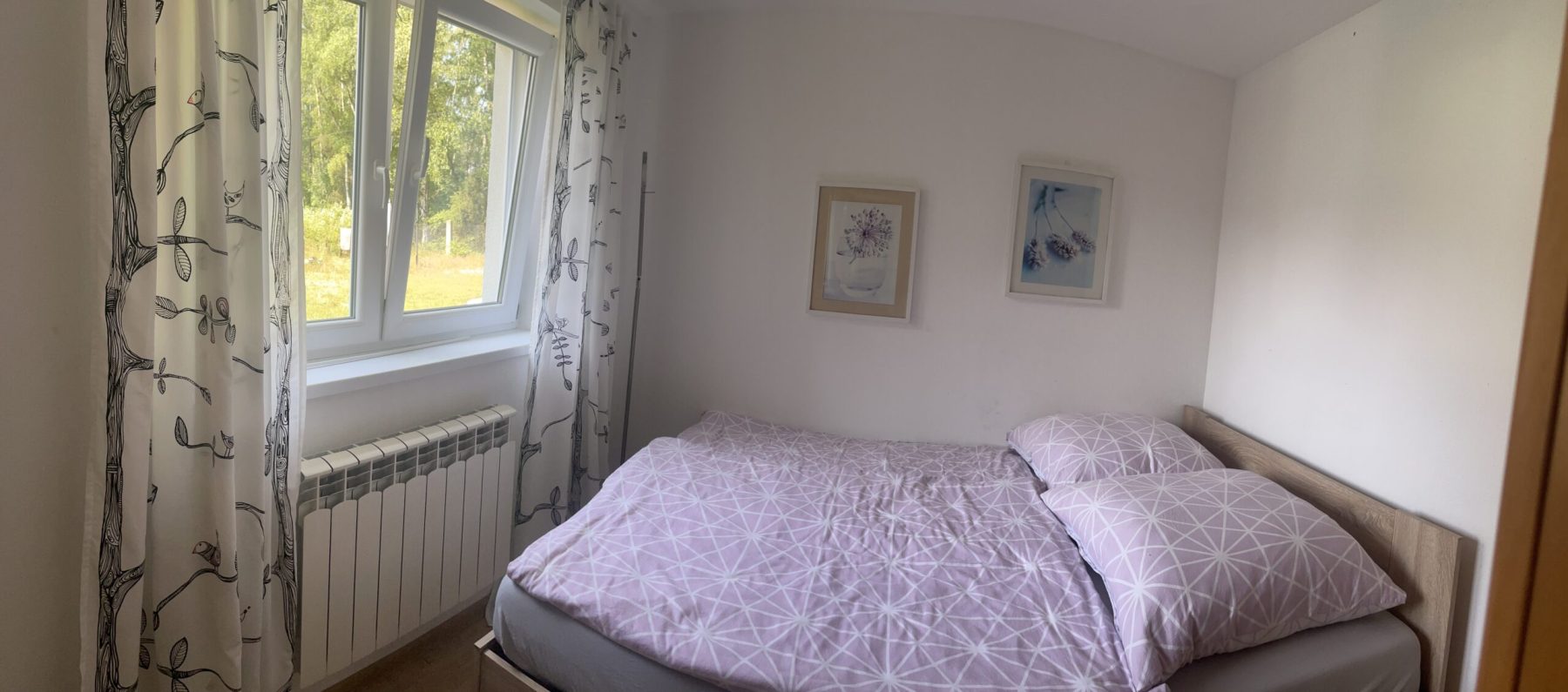 Tuż obok łazienki usytuowana jest przestronna sypialnia z widokiem na las, oferująca ciszę, prywatność i bezpośredni kontakt z naturą. Jasne wnętrza, drewniane wykończenia oraz funkcjonalny układ zapewniają poczucie komfortu i harmonii.