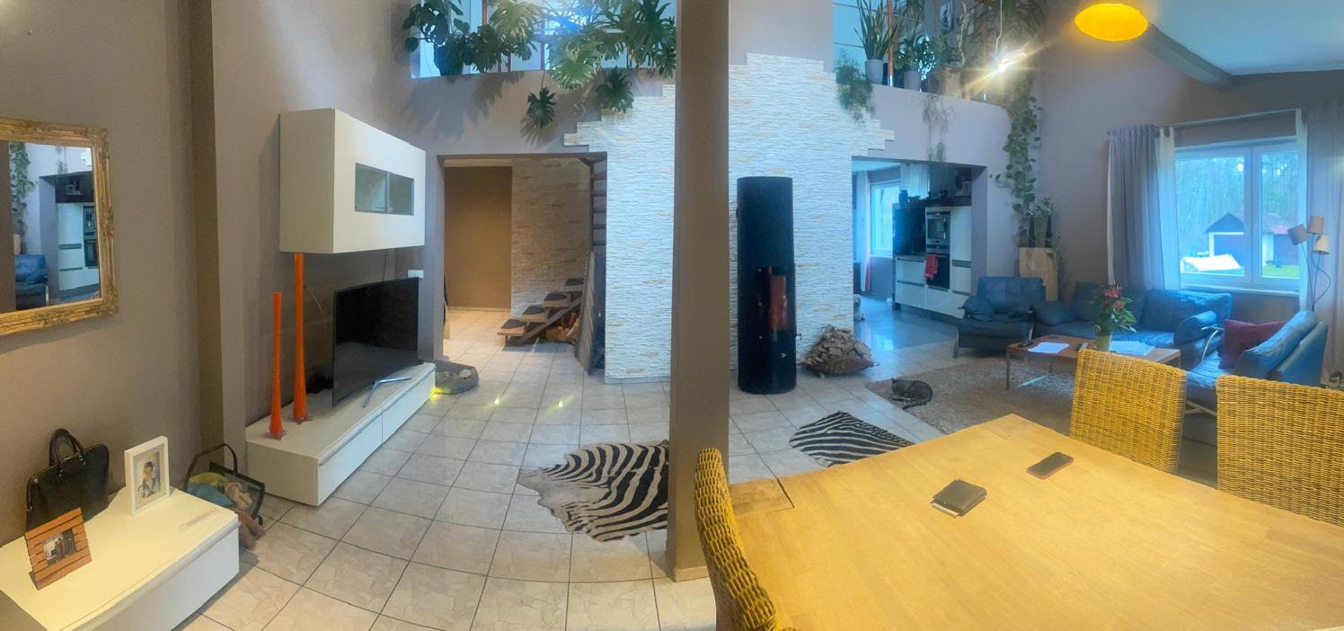 W salonie znajdują się ekskluzywne meble marki Hülsta oraz wysokiej klasy skórzane kanapy premium, łączące nowoczesny design z maksymalnym komfortem użytkowania. Kominek tworzy przytulną, domową atmosferę i sprawia, że przestrzeń idealnie sprawdza się zarówno do codziennego wypoczynku, jak i spotkań z rodziną czy gośćmi.