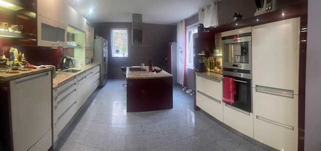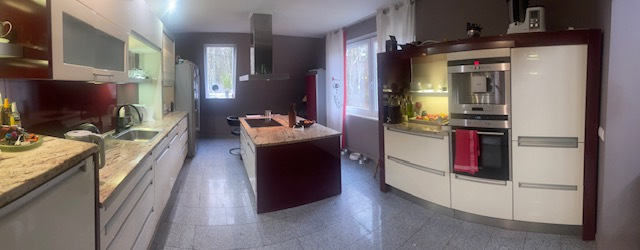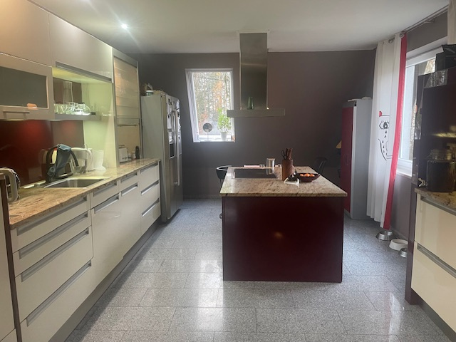 Nowoczesna kuchnia została zaprojektowana z myślą o wygodzie codziennego użytkowania i wyposażona w granitowe blaty robocze, centralną wyspę kuchenną, wolnostojącą lodówkę typu amerykańskiego (side-by-side) oraz wbudowany ekspres do kawy marki Siemens. Funkcjonalny układ oraz wysokiej jakości zabudowa podkreślają standard całej przestrzeni.