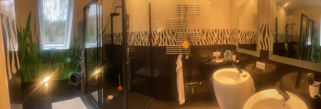 Na górnym poziomie apartamentu znajduje się nowoczesna łazienka wykończona naturalnym granitem, w której centralnym elementem jest wolnostojąca wanna, tworząca prywatną strefę relaksu i domowego spa. Eleganckie detale, wysokiej jakości armatura oraz staranne oświetlenie podkreślają prestiżowy charakter tej przestrzeni.
