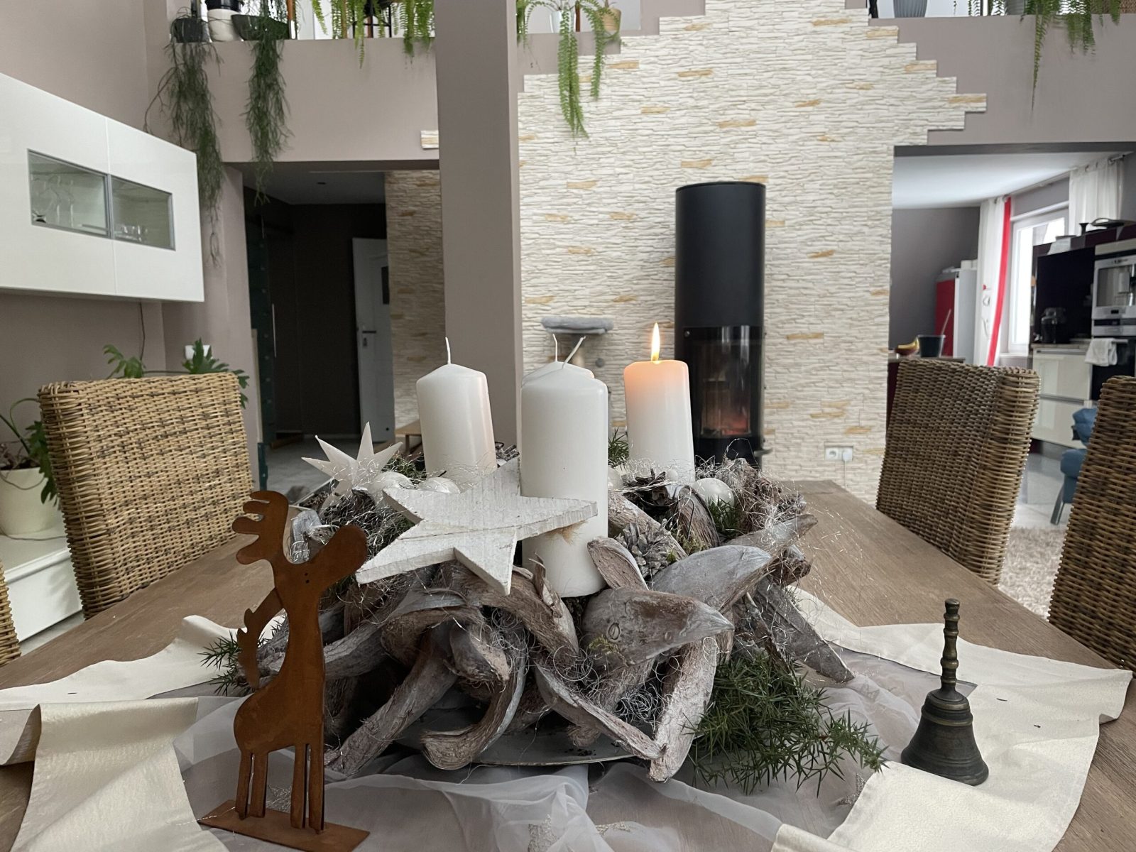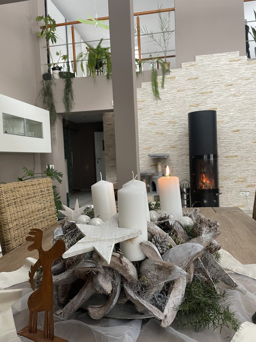 Sercem części dziennej jest kominek renomowanej marki HARK, stanowiący nie tylko źródło ciepła, ale również element klasy premium, budujący przytulną i elegancką atmosferę wnętrza. Wysokie sufity, jasna kolorystyka oraz naturalne materiały potęgują wrażenie przestronności i komfortu.