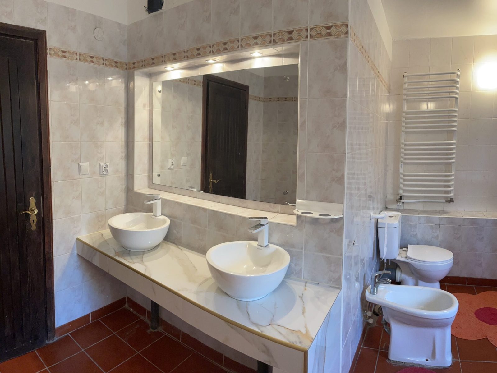 Łazienka została wykończona wysokiej klasy włoskimi płytkami, tworząc elegancką i nowoczesną strefę relaksu z przestronną kabiną prysznicową i komfortową strefą umywalek.