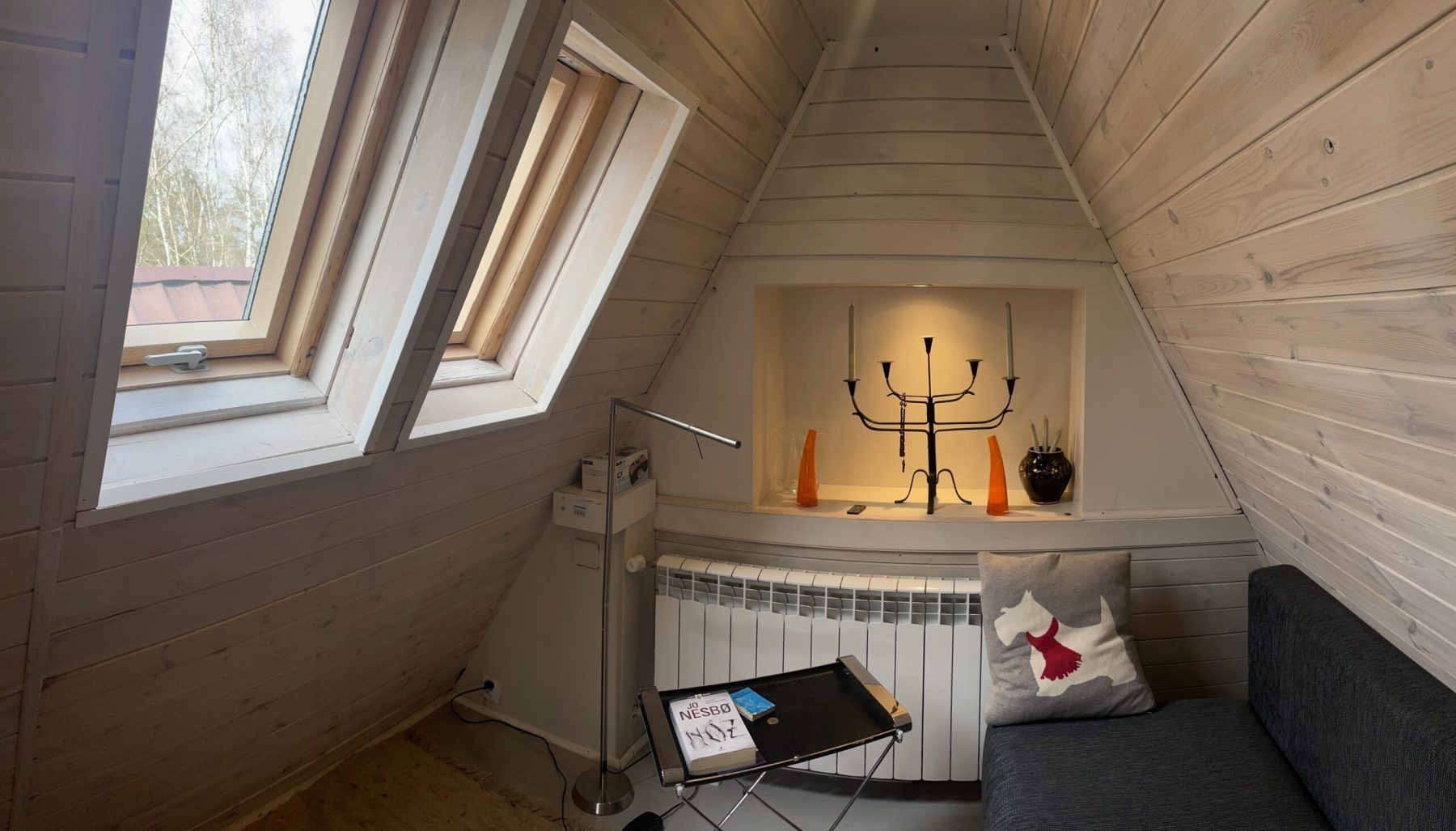 Na najwyższej kondygnacji znajdują się dwie niewielkie sypialnie, idealne jako pokoje do spania, przestrzeń dla dzieci lub pokoje gościnne. Skosy dachu nadają wnętrzom przytulny charakter. W dokumentacji fotograficznej zaprezentowano jedną z sypialni.