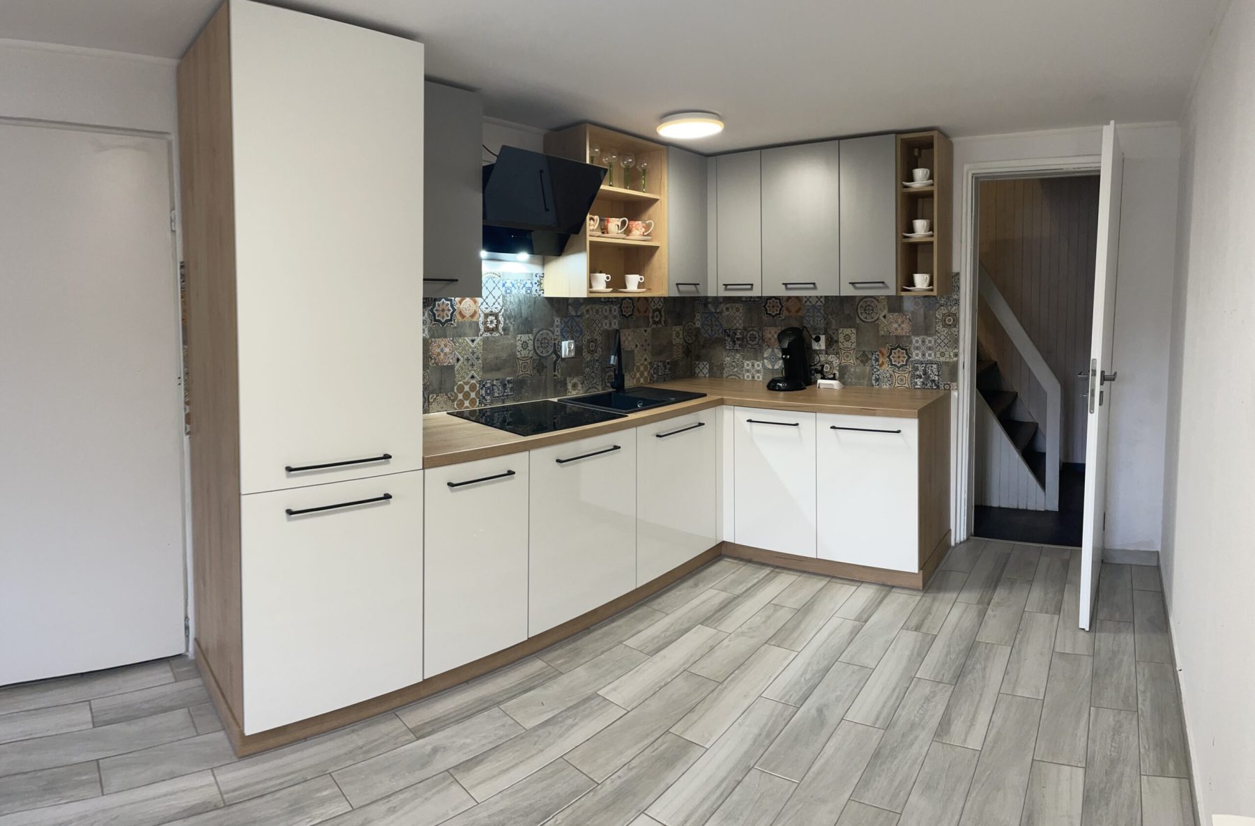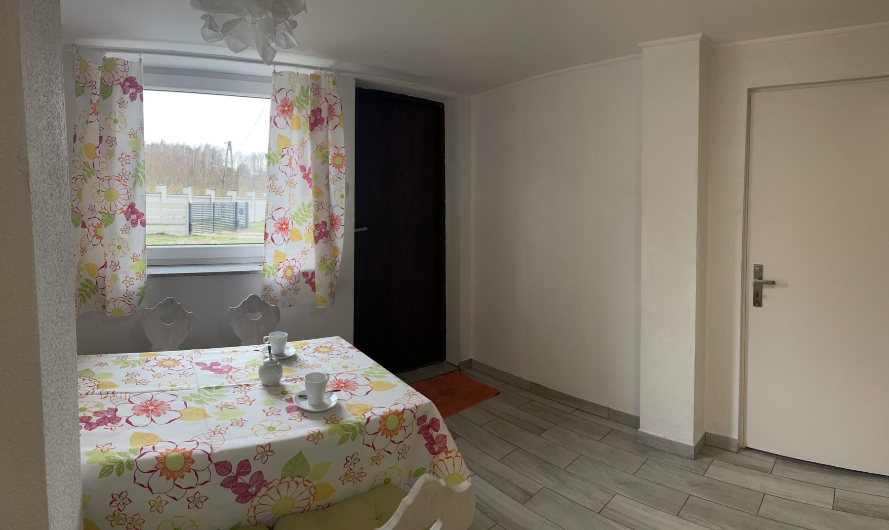 Wejście prowadzi bezpośrednio do kuchni połączonej z jadalnią, stanowiącej centralną część strefy dziennej. Kuchnia jest nowoczesna, zadbana i użytkowana od około 2 lat, wyposażona w praktyczną zabudowę, blat roboczy oraz niezbędny sprzęt AGD. Przestrzeń jadalni pozwala na swobodne codzienne posiłki.